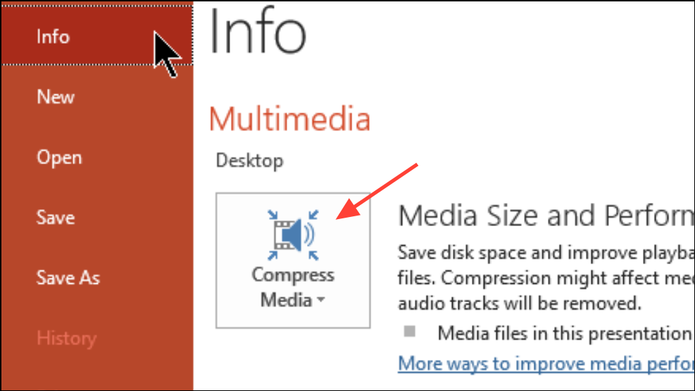 Step 3: To compress media, go to File > Info > Compress Media and select the desired compression level. This reduces file size and speeds up playback during presentations.