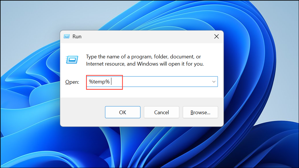 Step 1: Close PowerPoint and all other applications. Open the Run dialog by pressing Windows key + R. Type %temp% and press Enter to open the TEMP folder.