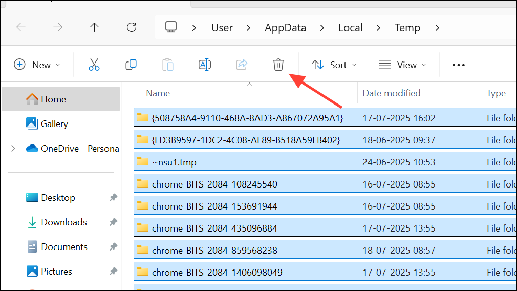 Step 2: Select all files in the TEMP folder (press Ctrl + A), then press Delete on your keyboard. If prompted, skip any files in use. Deleting these temporary files removes old cache and leftover data that can bog down PowerPoint and other programs.