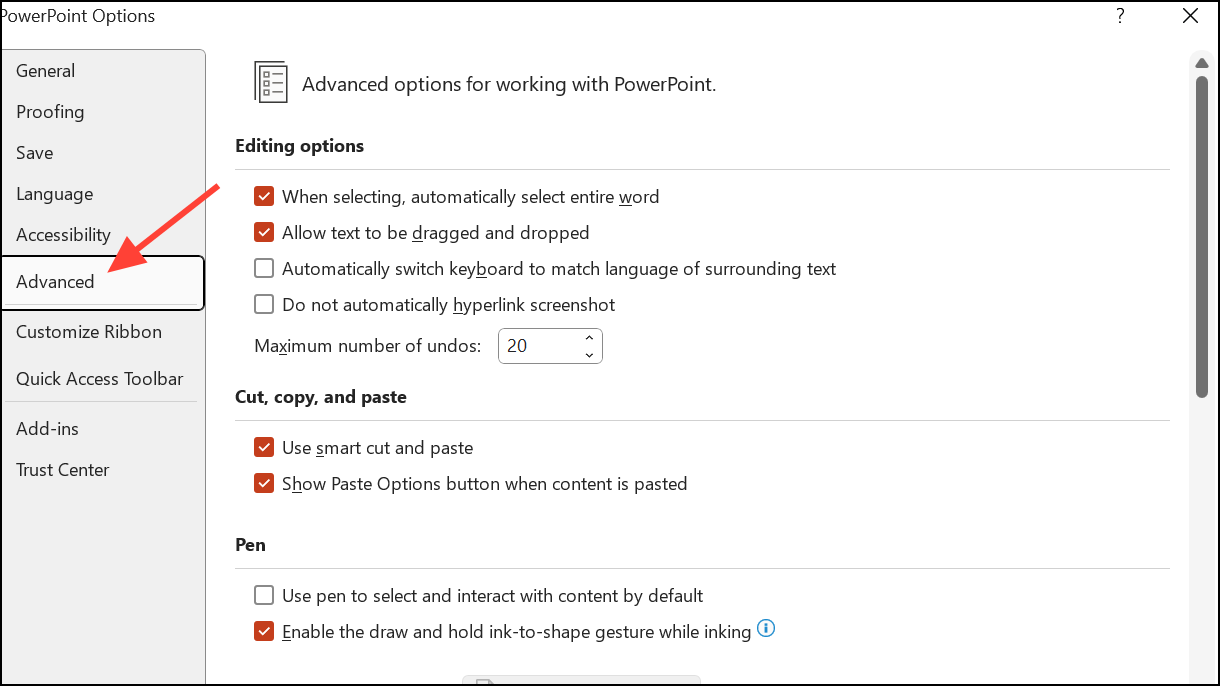 Step 1: In PowerPoint, go to File > Options > Advanced.