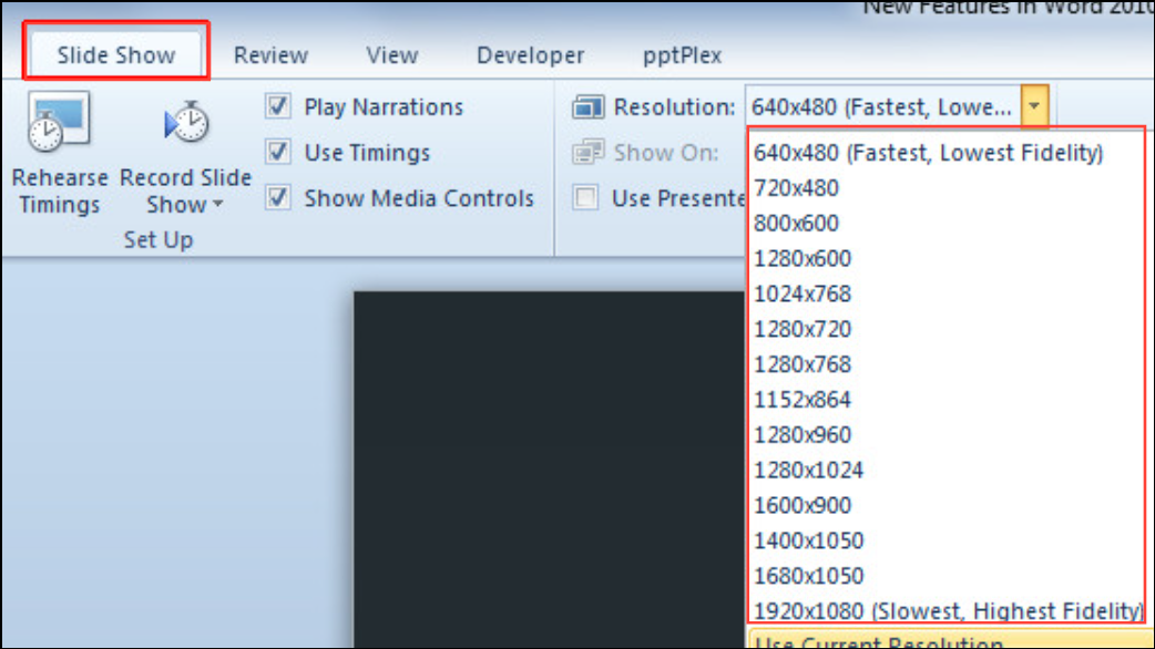 Step 3: For presentations with lag during slide shows, open the Slide Show tab, find the Monitors group, and adjust the Resolution dropdown. Select a lower resolution, such as 640x480, to speed up rendering. If slide images shift or display incorrectly, revert to Use Current Resolution.