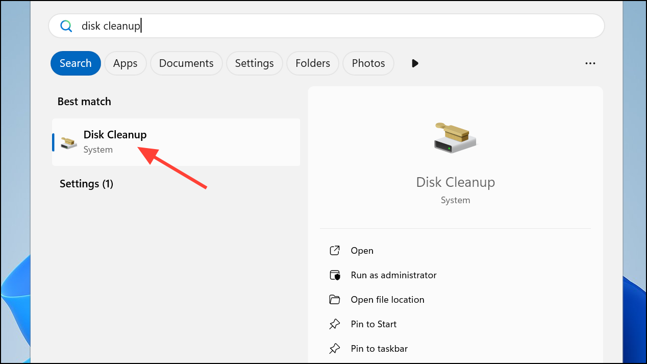 Step 2: Run Disk Cleanup by searching for it in the Start menu and selecting your system drive. Remove temporary files, system cache, and other unneeded data to increase available disk space.