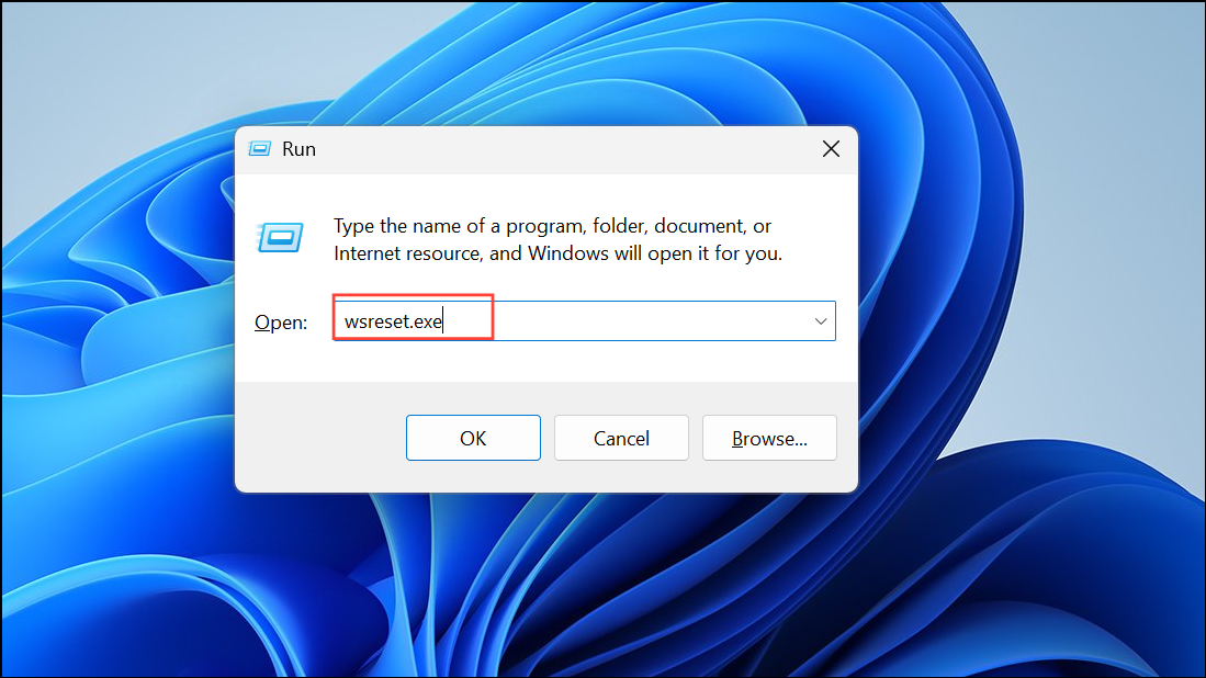 Step 2: Type wsreset.exe and press Enter. A blank Command Prompt window will appear for several seconds, then close automatically.