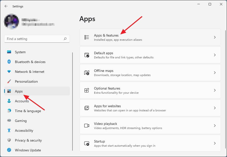Startbutton on your taskbar and select Settings. - In the Settings window, click on Apps from the left sidebar, then choose Apps & features on the right.