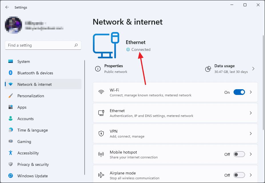 Windows+i. - Select Network & internet from the left sidebar.