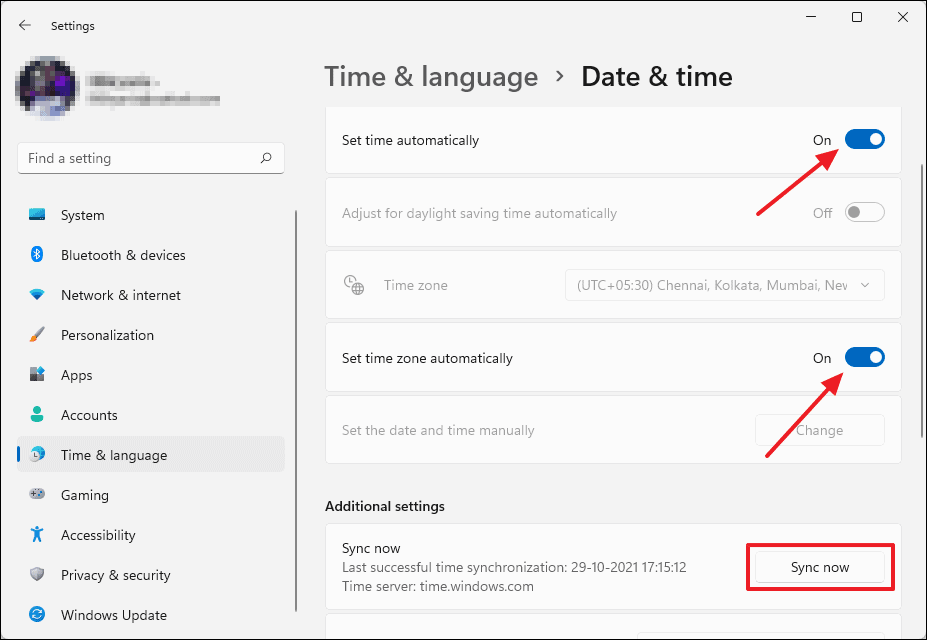 - Toggle on Set time automatically and Set time zone automatically.
