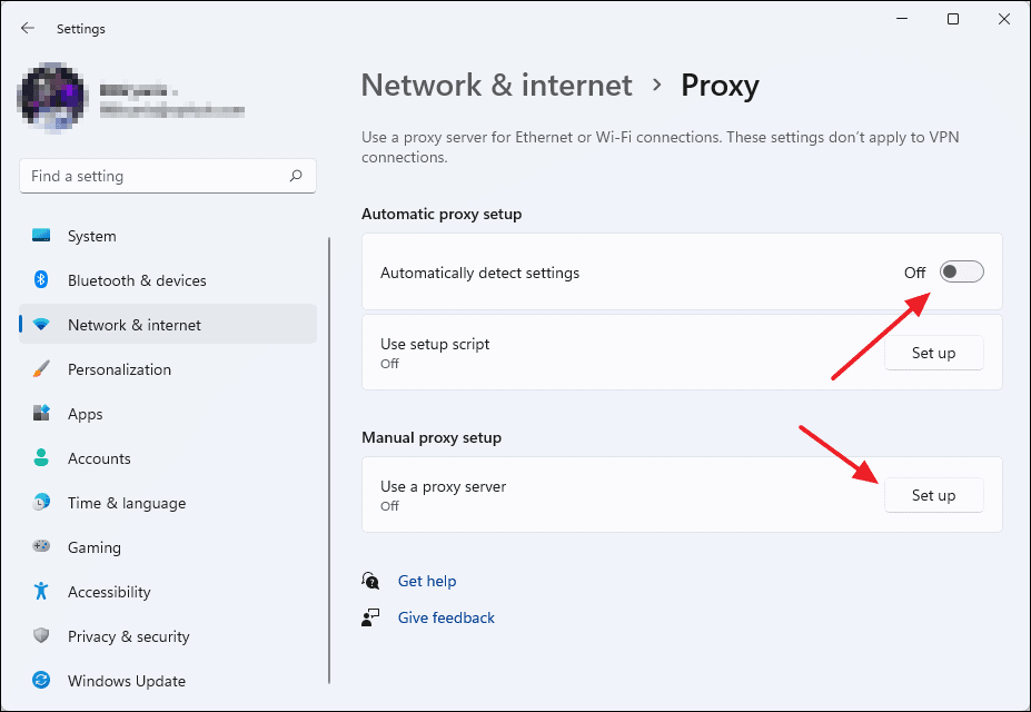 - Under Automatic proxy setup, toggle off Automatically detect settings.