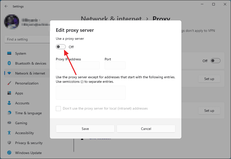 - In the Edit proxy server window, toggle off Use a proxy server and click Save.
