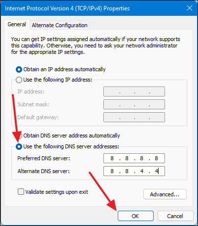 8.8.8.8as the Preferred DNS server and8.8.4.4as the Alternate DNS server. - Click OK to save the changes.