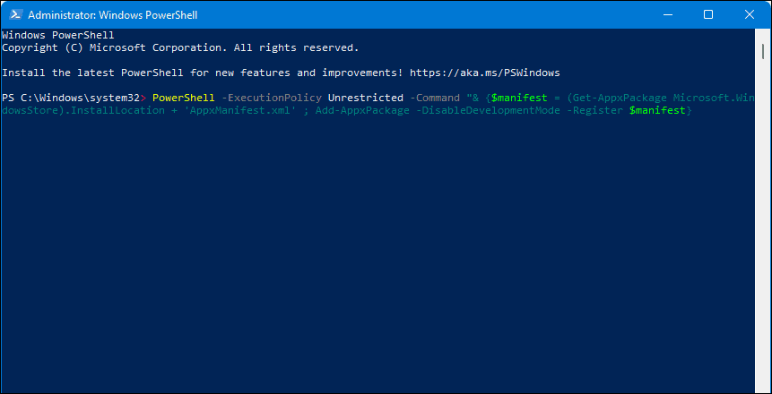 PowerShell -ExecutionPolicy Unrestricted -Command "& {$manifest = (Get-AppxPackage Microsoft.WindowsStore).InstallLocation + 'AppxManifest.xml' ; Add-AppxPackage -DisableDevelopmentMode -Register $manifest}"