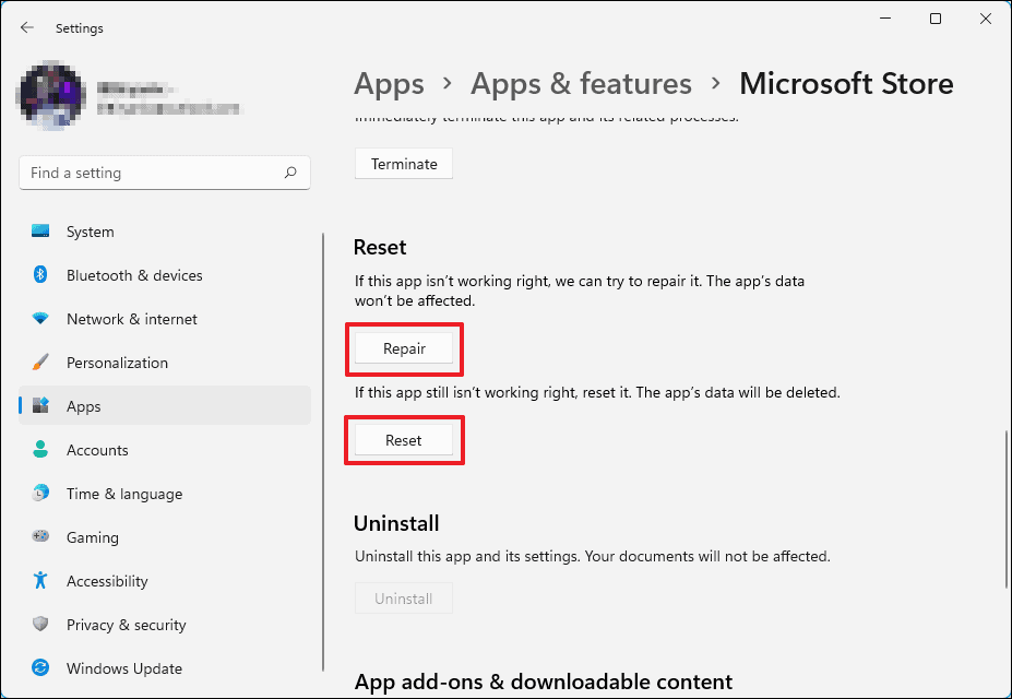 One of the simplest ways to fix issues with the Microsoft Store is to reset or repair the application through the app settings.