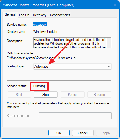 - In the Properties window, set the Startup type to Automatic and ensure the Service status is Running. If not, click Start.