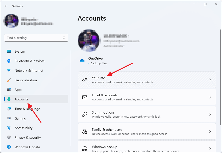 - Open Settings and select Accounts, then click on Your info.