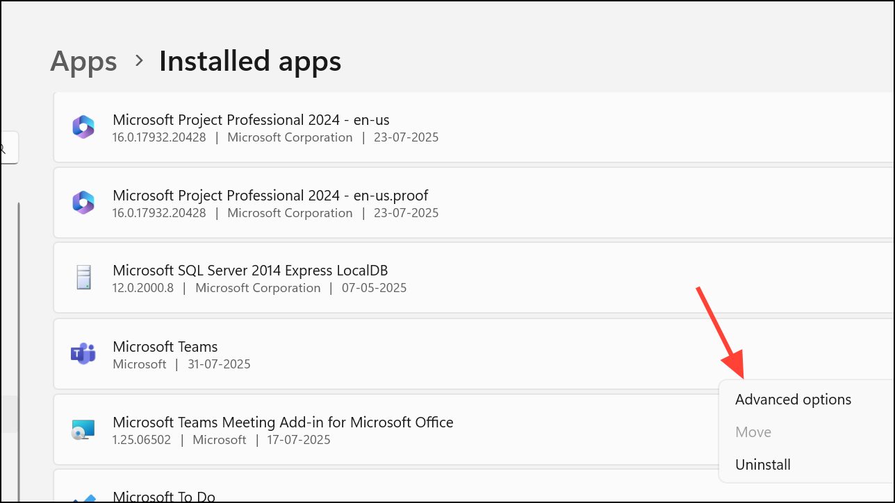 Step 2: Locate Microsoft Teams in the list. Click the three dots beside it and select Advanced options.