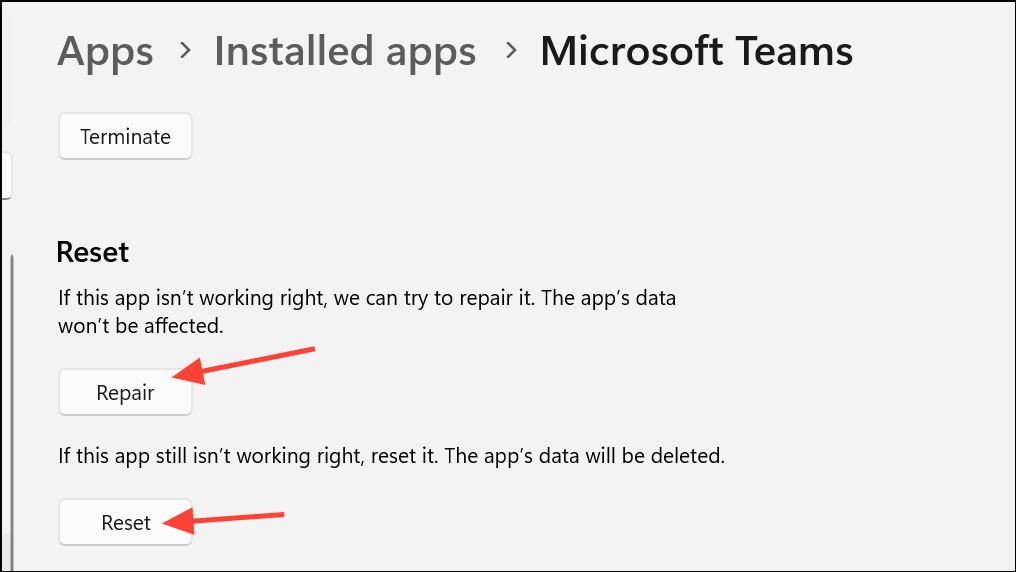 If Teams continues to crash, repairing or resetting the app can address corrupted installation files or settings without requiring a full uninstall. Repair attempts to fix issues while preserving data; reset returns the app to its default state, which may log you out.