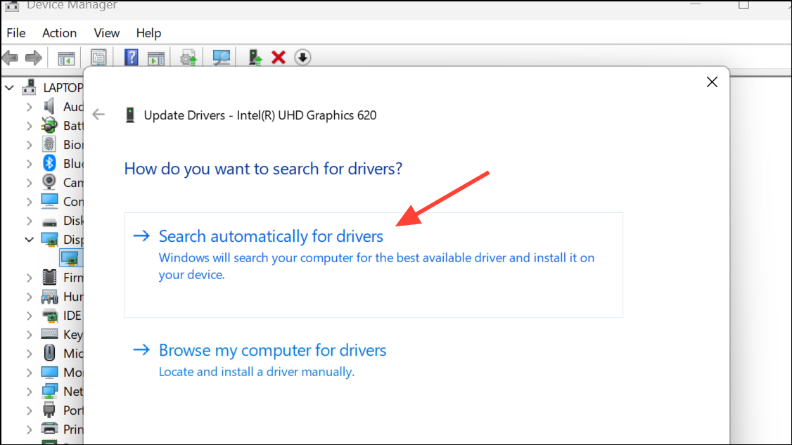 Step 2: Expand Display adapters, right-click your graphics card, and select Update driver. Choose Search automatically for drivers. If no update is found, check your device manufacturer's website for the latest drivers.