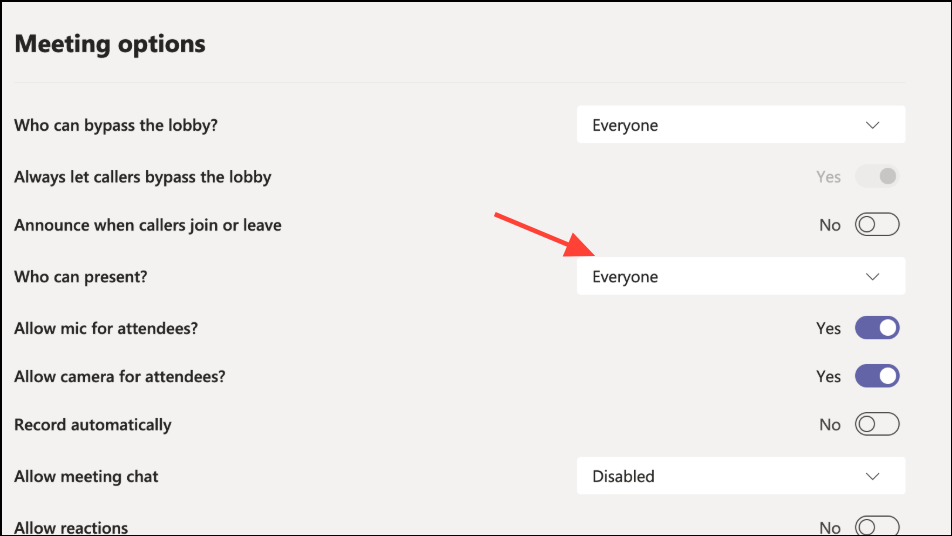 Step 1: For meeting organizers, open Meeting Options and set Who can present to Everyone or the appropriate group.