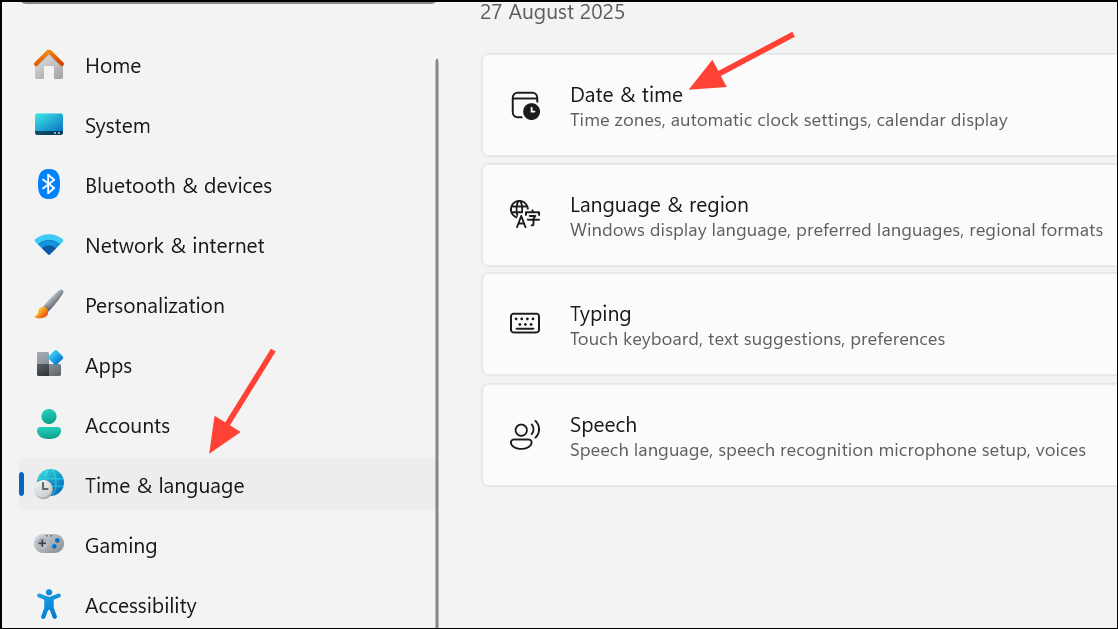 Step 2: Select Time & language from the left menu, then click Date & time.