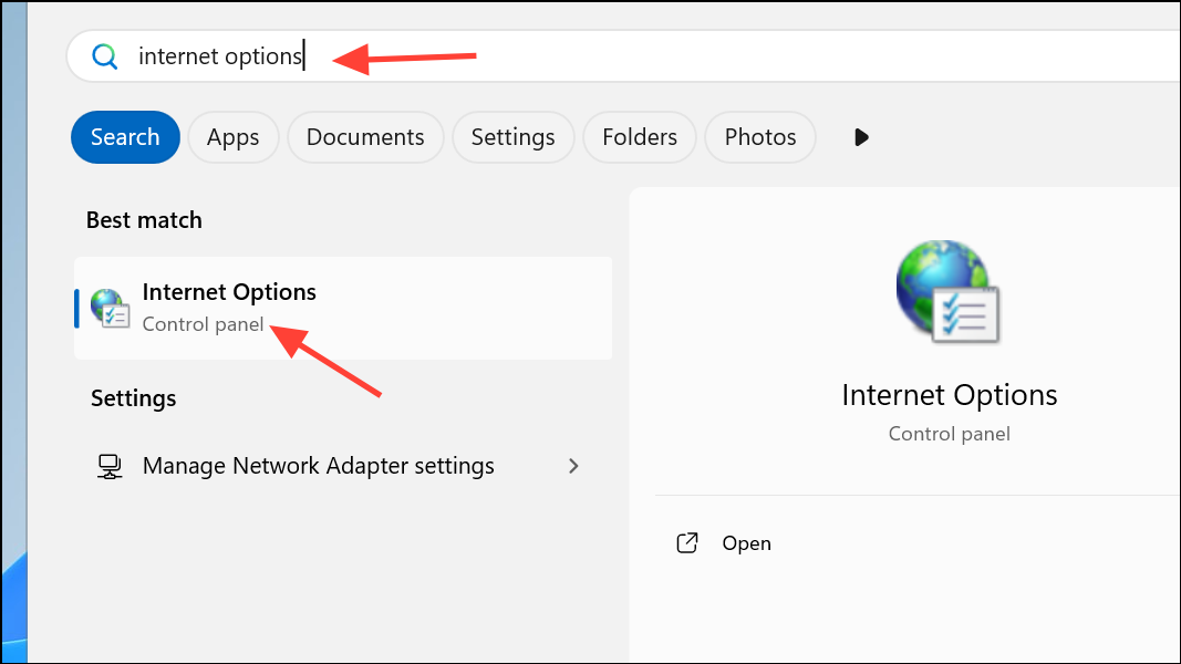 Step 1: Open the Start menu and search for Internet Options. Select the matching result to open the Internet Properties window.