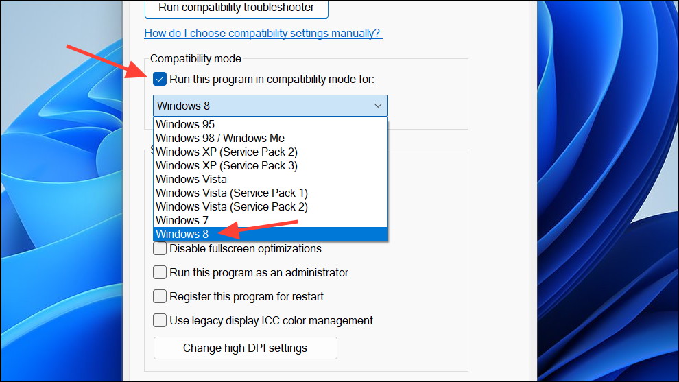 Step 3: Click Run compatibility troubleshooter or manually check Run this program in compatibility mode for and select Windows 8 or Windows 7.