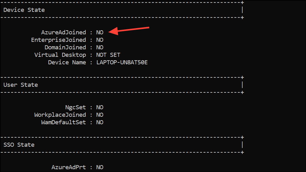 Step 2: Look for AzureAdJoined : YES in the output. If it shows NO, your device is not properly registered with Azure AD, which can block Teams authentication.