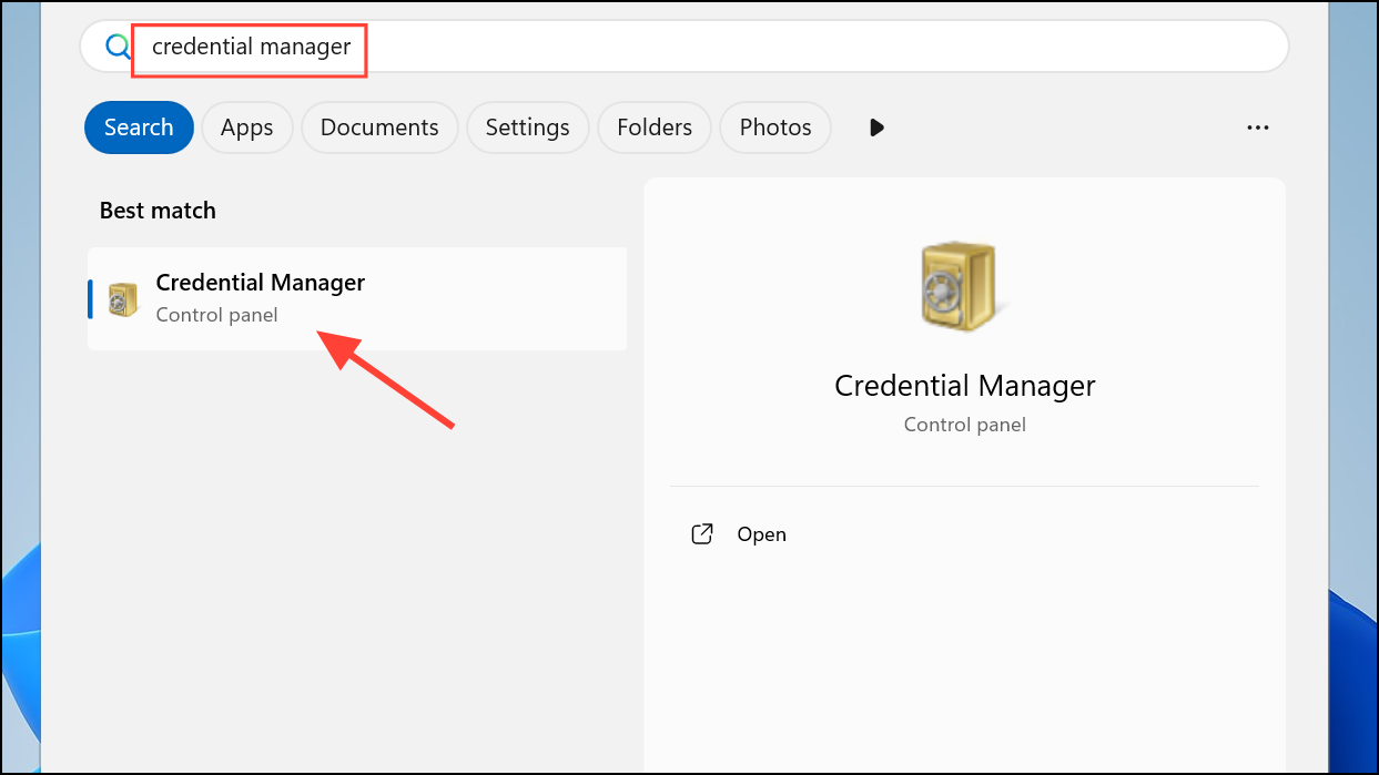 Step 1: Open the Windows search bar and type Credential Manager, then press Enter.