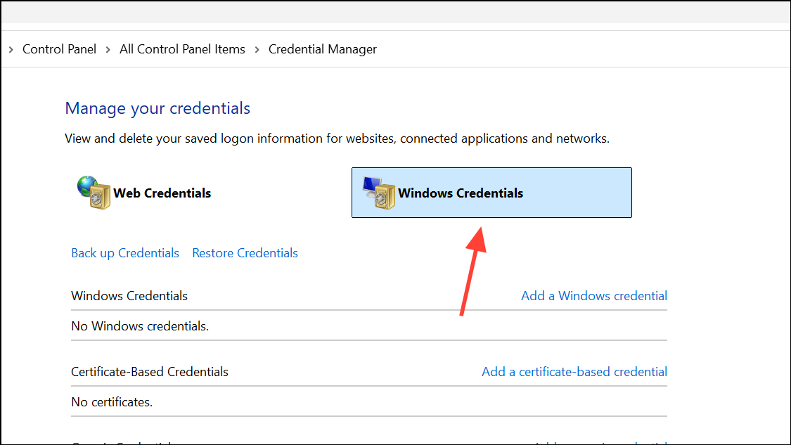 Step 2: Select Windows Credentials from the menu.