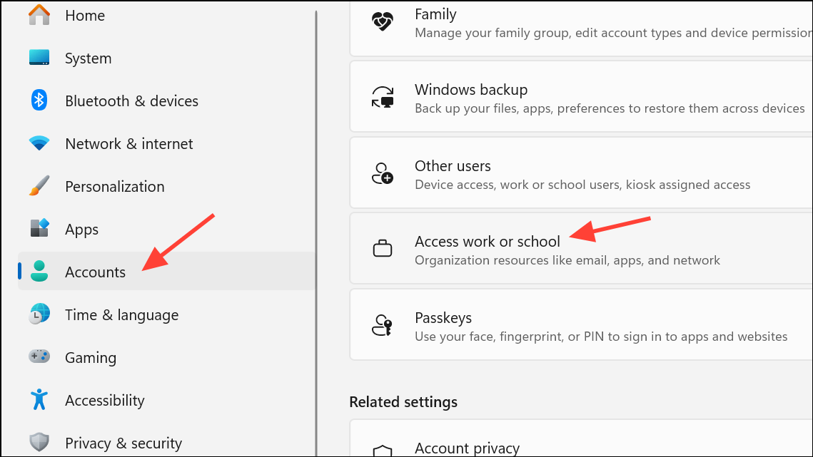 Step 2: Go to Accounts and choose Access work or school.