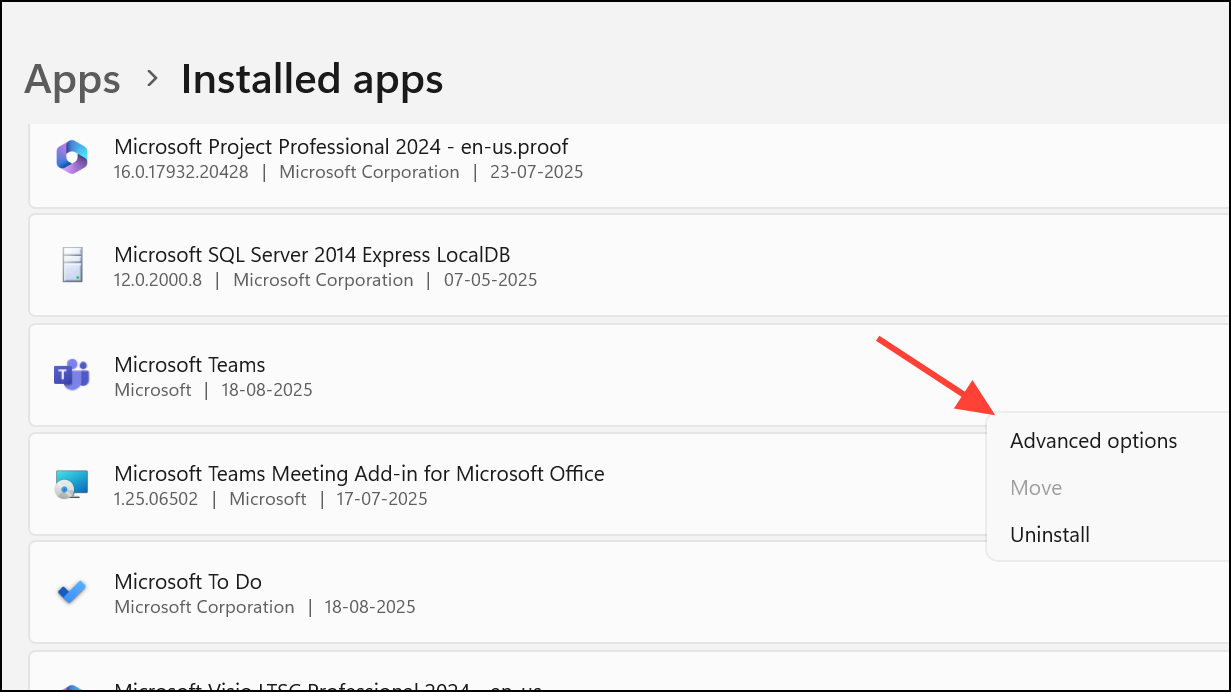 Step 2: Scroll through the app list to find Microsoft Teams. Click the three-dot menu and select Advanced options.
