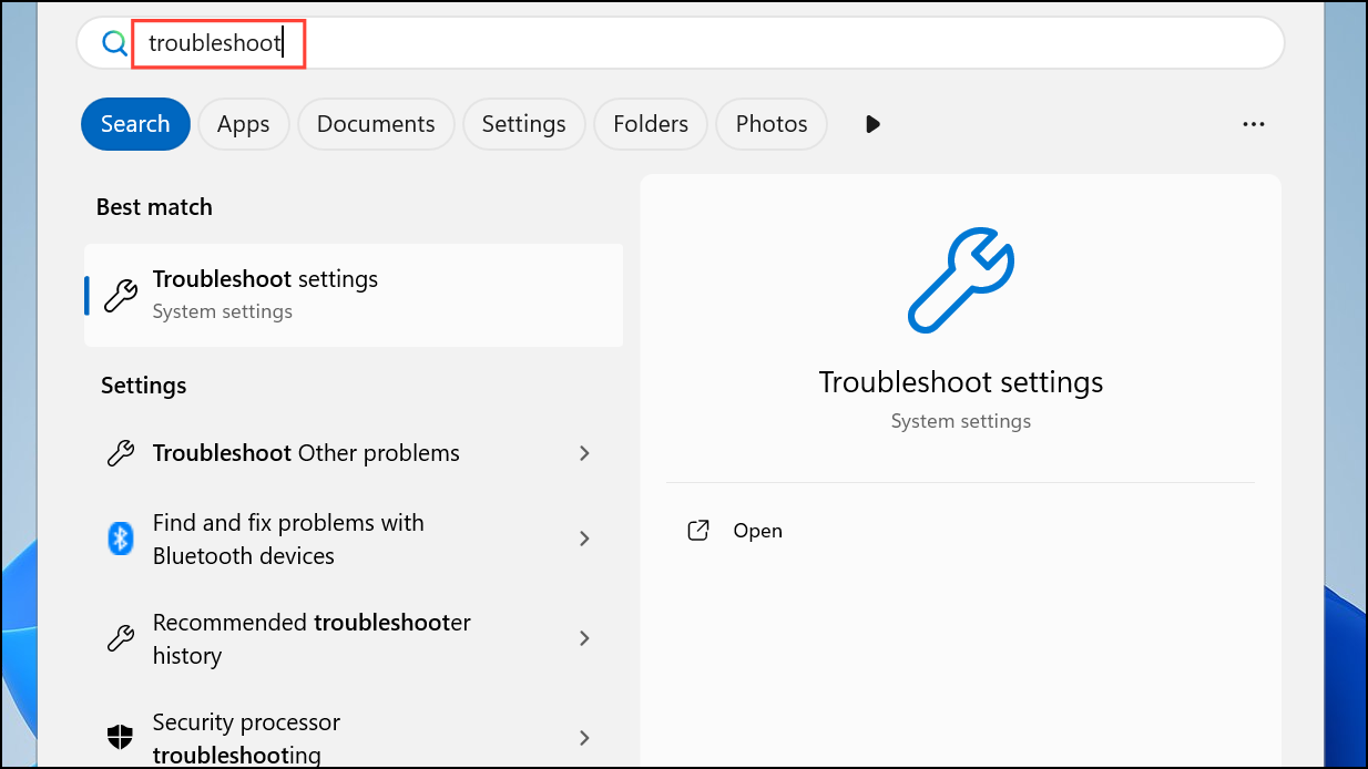 Step 1: Type Troubleshoot in the Windows search bar and press Enter.