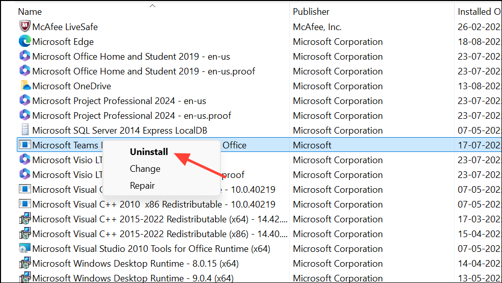 Step 2: Select Microsoft Teams, right-click, and choose Uninstall. Follow the prompts to remove the app.