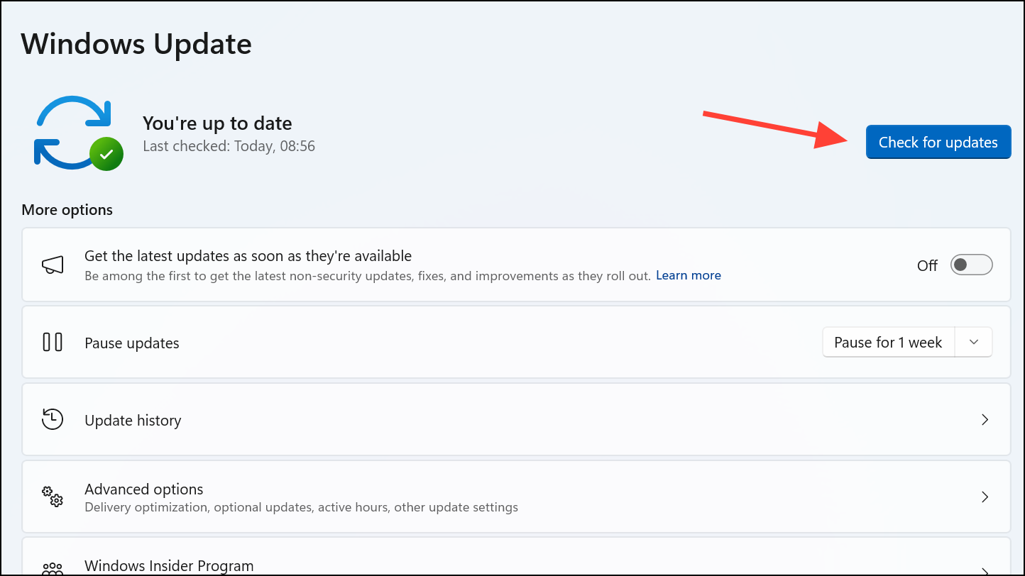 Step 2: Click the "Check for updates" button. Windows will automatically search and install any available updates. After updating, reboot your computer and retry the Microsoft Teams installation.