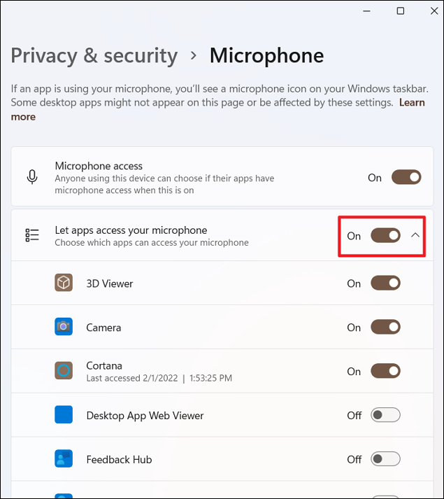 Enabling this option gives microphone access to all apps as long as you enable permission for those apps as well.