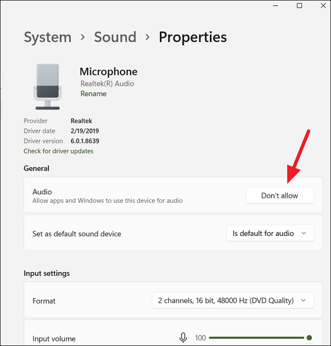 Then, make sure ‘Don’t allow’ is showing on the button next to ‘Audio’ under the General section. If you click the ‘Don’t allow’ button, the mic will be disabled, so don’t do that. And if you see ‘Allow’ on the button, click on it to enable the mic.