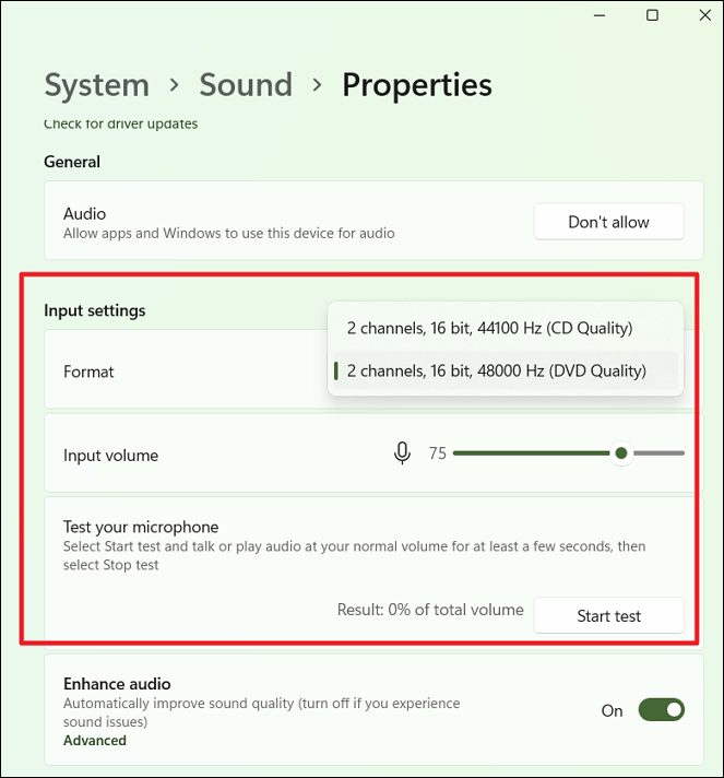 In some cases, enabling the ‘Enhance audio’ feature could improve your Microphone audio quality. You can toggle the feature on and off and see which works best for you.