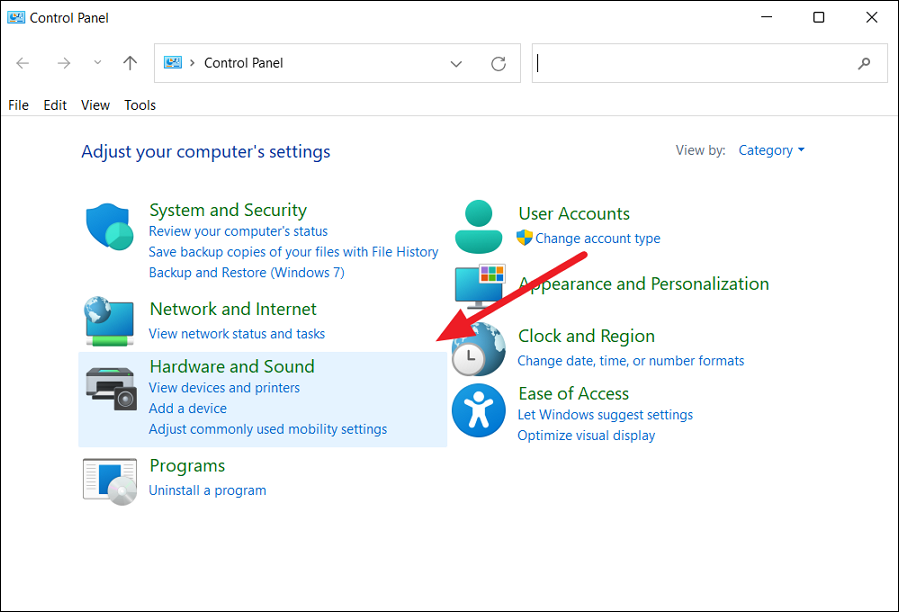 In the Control panel, make sure you are viewing the settings in category view and select the ‘Hardware and sound’ category.