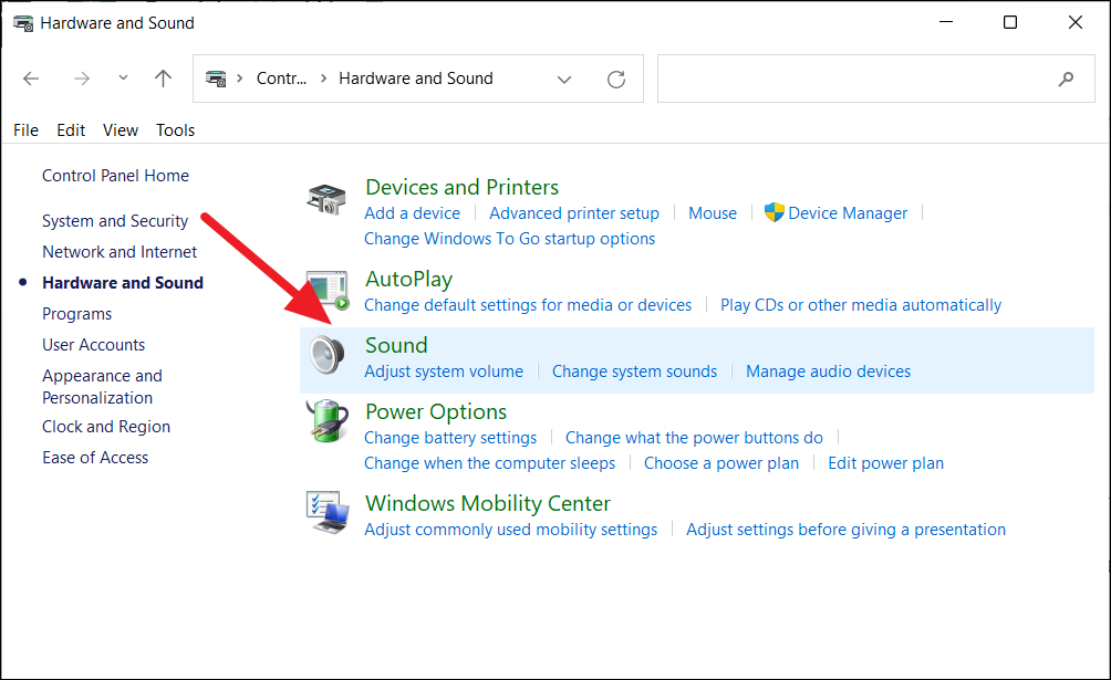 In the next window, you can either click the ‘Sound’ option or the ‘Manage audio devices’ link to open the Sound Properties dialog box.