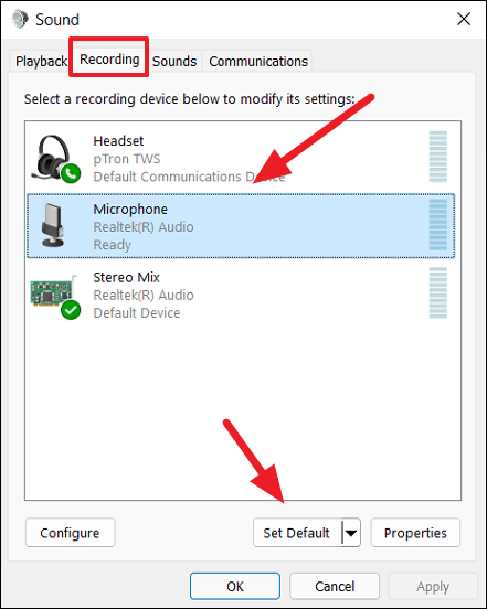 Then, go to the ‘Recording’ tab and select the correct input device and select the ‘Set Default’ button below to set that device as default.