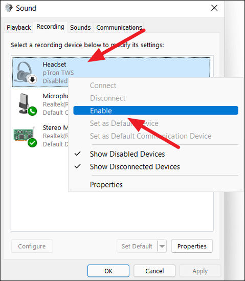 To enable a microphone device, right-click on a recording device and select ‘Enable’.