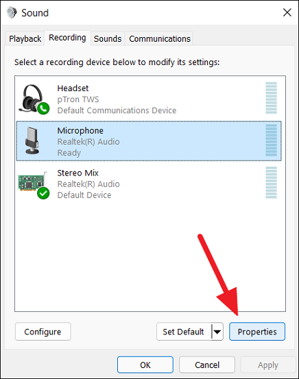 To change the microphone settings, select the microphone and click the ‘Properties’ button.