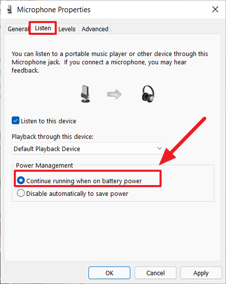 Windows automatically disables the mic whenever the PC is on battery. To prevent this, go to the ‘Listen’ tab and make sure that the ‘Continue running when on battery power’ option is selected under the Power Management as shown below.