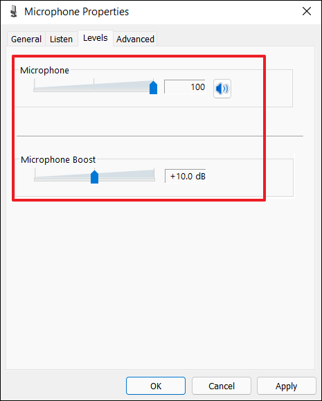 Next, switch to the ‘Levels’ tab in the Microphone Properties dialog box. Here, you can adjust the intensity level by dragging the Microphone volume slider left and right to ensure that you have the right level of the input volume. You can also try boosting the Microphone by adjusting the ‘Microphone Boost’ slider to improve the microphone sound.