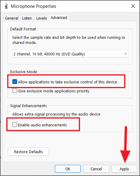 After that deselect the ‘Enable audio enhancements’ option and click ‘Apply’ and then ‘OK’ to save the changes.