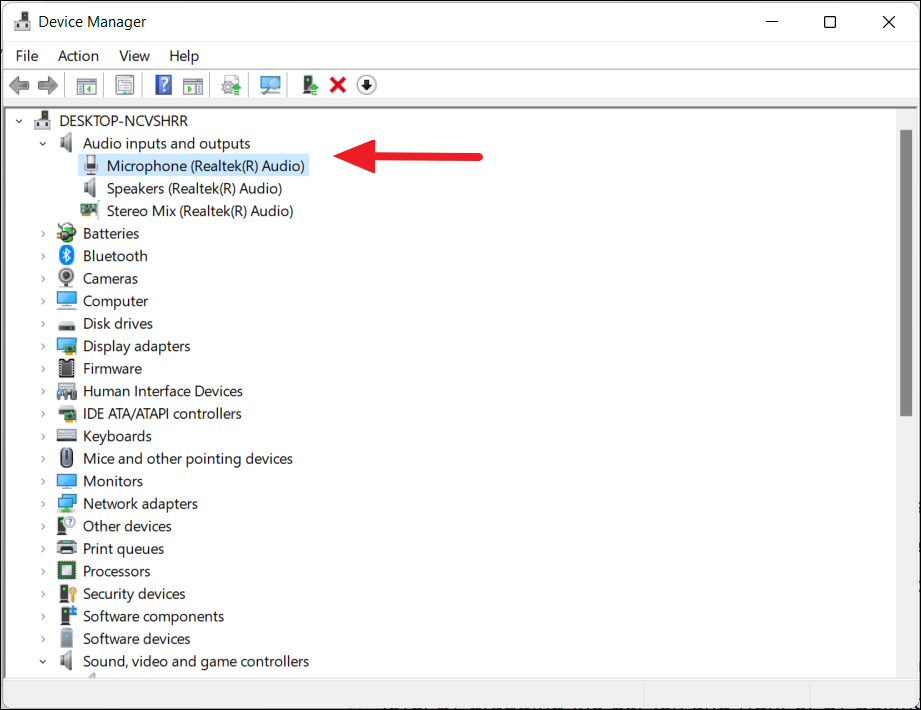 In the Device Manager, expand ‘Audio inputs and outputs’ and you will see your microphone listed under there.