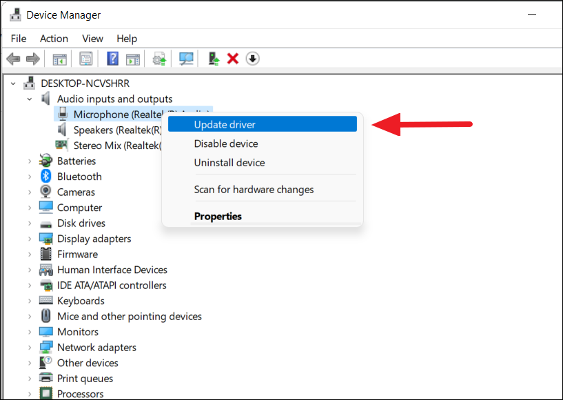 To update the driver, right-click on the microphone device you want to update, and select ‘Update driver’.