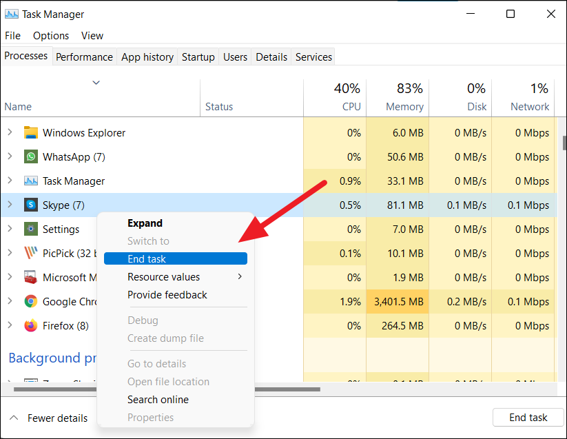 Open Task Manager by searching for it in Windows search or by pressing the Ctrl+Shift+Esc shortcut. In the Task Manager, locate ‘Skype’, right-click on it, and select ‘End Task’.