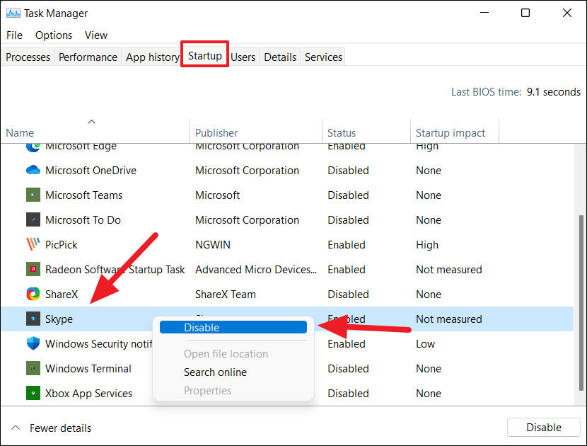 To disable Skype from autorun, switch to the ‘Startup’ tab. Then locate ‘Skype’, right-click on it, and select ‘Disable’.