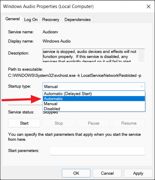 This will open the Windows Audio Properties dialog box. Here, click the ‘Startup type:’ drop-down and select ‘Automatic’.