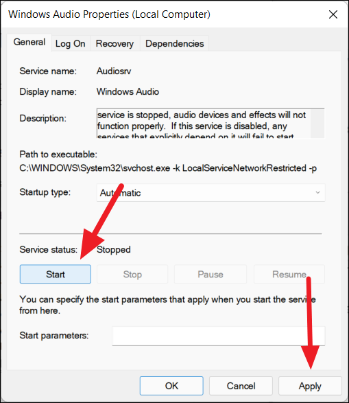If the Service status is Stopped, click the ‘Start’ button to start the audio services. Then, click ‘Apply’ and then ‘OK’.
