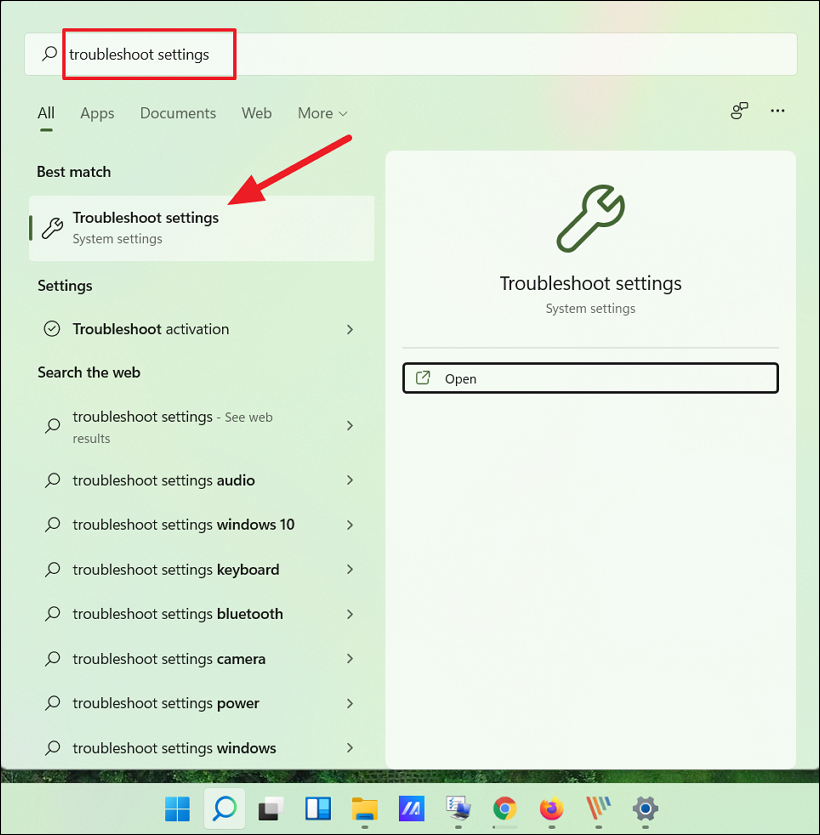 First, click on the Start menu and search for ‘Troubleshoot settings’ in the Windows search. From the search results, open ‘Troubleshoot settings’.